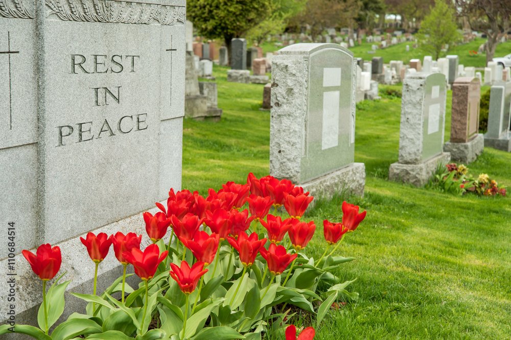 RIP headstone with red flowers