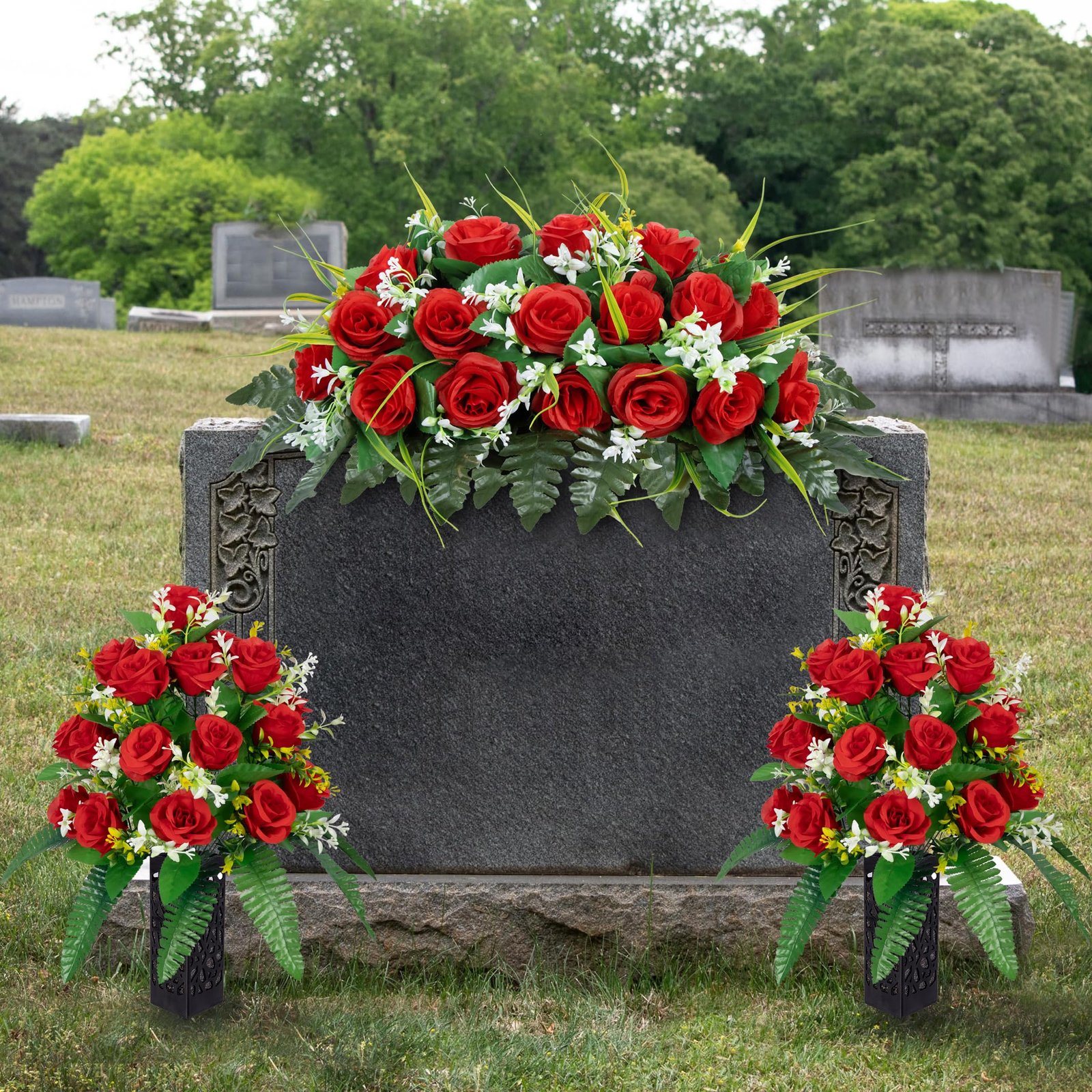 Be the first to review “Row of flowers- red roses at headstone markers”