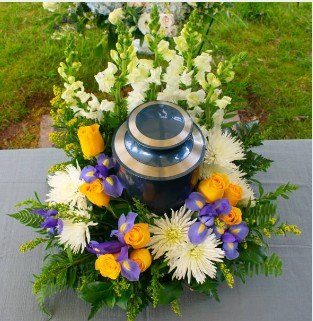 Be the first to review “Small Arrangement and Urn orange-purple”